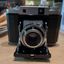 Amerikanische Sucherkamera (1948 bis 1951) von Kodak mit einem außergewöhnlichen Feature: der Gehäuseauslöser ist in die ausklappbare Frontplatte integriert. Sie verwendet Rollfilm 620 mit dem Aufnahm...